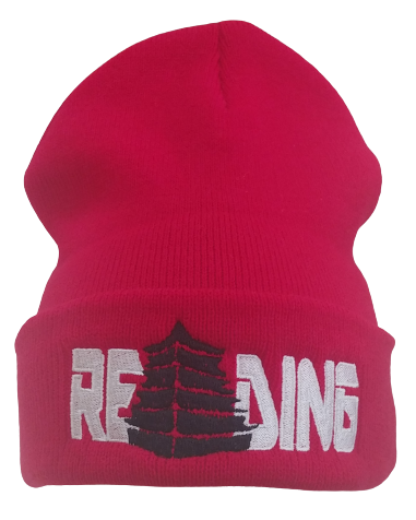 This Red Knit beanie style hat has a folded up brim for extra warmth. Reading is embroidered in White with a Black Pagoda. Grab a warm beanie hat today.