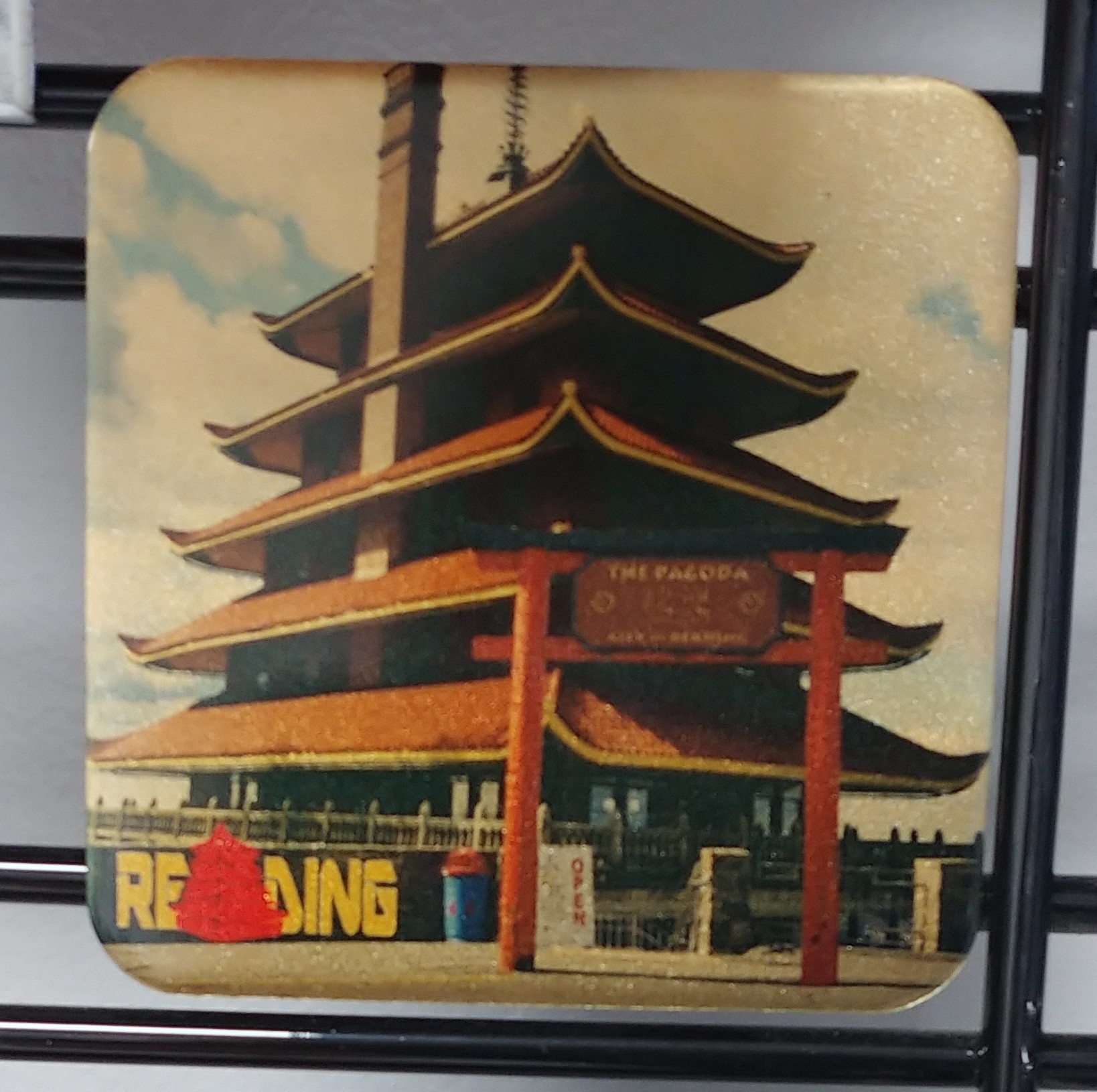 With a Gold Sparkle background this Larger sized Magnet has a distance Vintage took. It showcases The Reading Pagoda with Pagoda Apparel’s Classic Reading design .